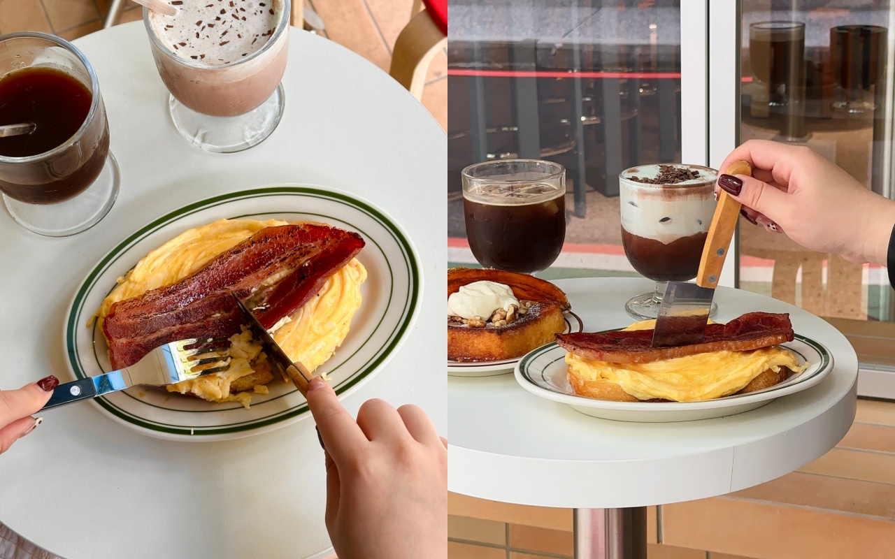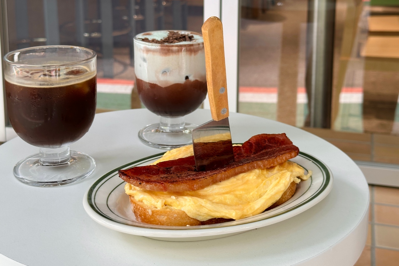 「整條培根炒蛋超級酸種」絕對是Local Local 中⼭的人氣餐點,超大片培根上面插上小刀子,視覺效果100分