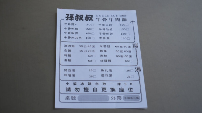 花蓮鳳林 孫叔叔牛骨牛肉麵 菜單
