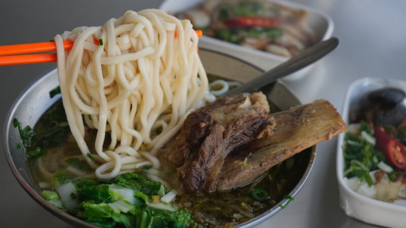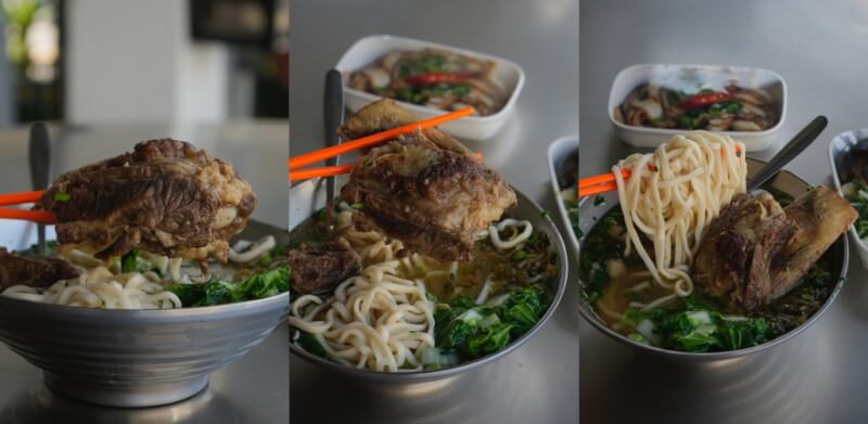 店家招牌牛骨麵,份量十足包含超大塊牛腱肉、牛筋與一根牛骨,清燉湯頭甘甜爽口,麵條還有多種選擇,如果不吃牛也有豬肉品項可以選擇。
