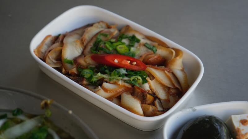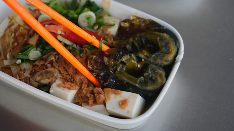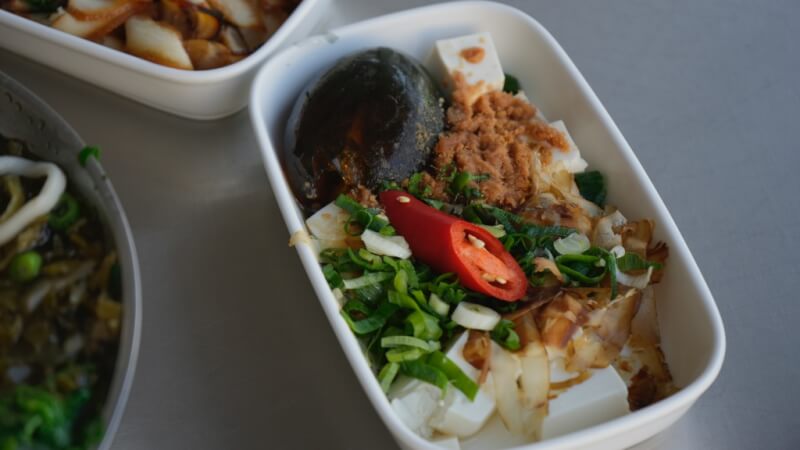 嫩豆腐淋上古早味醬油膏,鋪滿整顆皮蛋與柴魚片,冰涼口感超解膩。